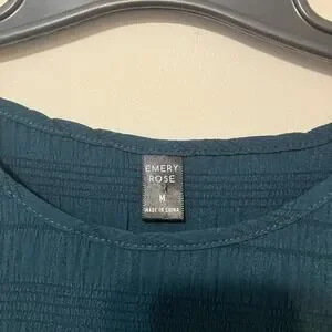 Emery Rose women's blouse in a dark green color. Features a textured fabric with a subtle checkered pattern. Short sleeves and a round neckline. The blouse has a relaxed fit with a gathered waist and ruffled hem for added style. Perfect for casual or office wear.