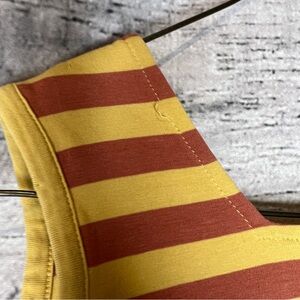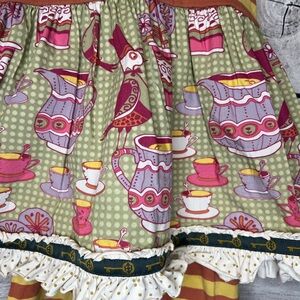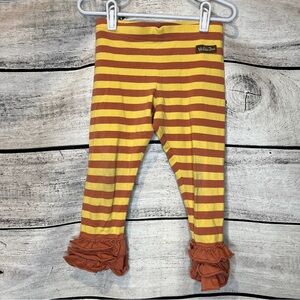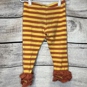 Charming dress with yellow and orange stripes. Features tea cups and birds print. Includes matching leggings with ruffle detail.