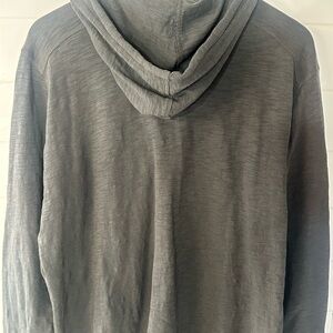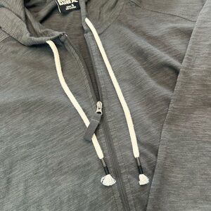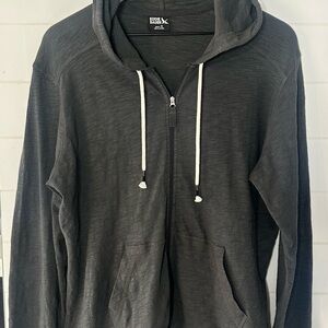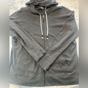 Stylish dark gray zip-up hoodie with drawstrings, front pockets. Perfect for casual wear. 💯 cotton. Excellent condition.