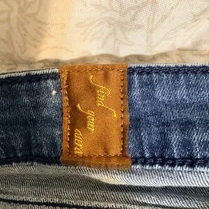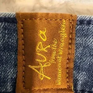 Aura jeans featuring a classic blue denim with a distinctive brown label. Perfect for casual wear.