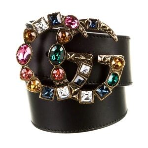 Elegant black Gucci belt. Adorned with multicolor gemstones. Perfect for adding a touch of luxury. With box.