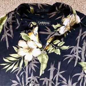 Vintage men’s Caribbean Blues Hawaiian shirt - light and comfy for summer vacations! Classic hibiscus and bamboo print on a black background. See photos for description and defects.