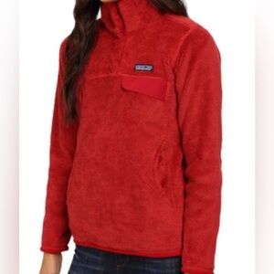 Pre owned. Good condition. Signs of use shown in pictures. Soft red plush fleece pullover with a front kangaroo pocket. Small Patagonia logo patch on chest. Comfortable for layering and everyday wear.
