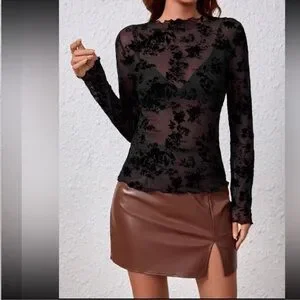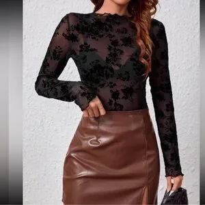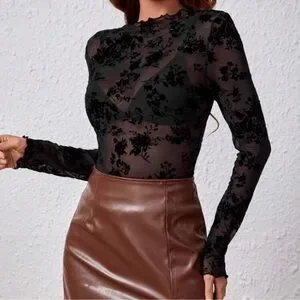 Black Floral Pattern Mesh Long Sleeve Fitted Sheer Shirt Stretchy