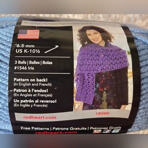 Bundle of Red Heart yarn in vibrant purple, blue, and red. Perfect for knitting and crochet projects.