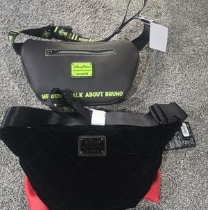 Black loungefly belt bag with a red Minnie Mouse bow design. Brown and green loungefly belt bag featuring Bruno(glow in the dark)