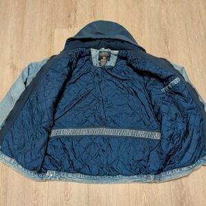 Vintage Faded Glory Mens L Blue Denim Hooded Jacket Quilted Lined Distressed