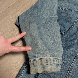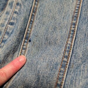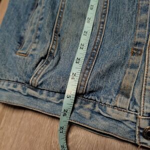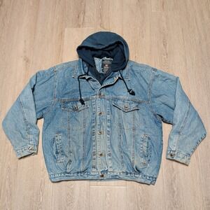 Please note zipper is missing, Faded Glory Outdoors denim jacket offers a rugged aesthetic with its medium wash finish and integrated navy blue hood. Designed for utility and warmth, it features a quilted nylon lining and a dual-closure system with both a zipper and buttons. The classic trucker silhouette is updated with functional hand pockets and button-flap chest pockets, making it a versatile layer for transitional weather.