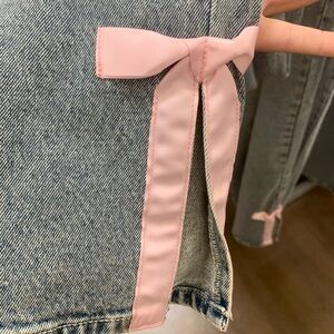 Baggy light stone wash wide leg jeans. Adorned with a cute pink bow. Ideal for casual wear.