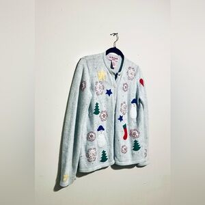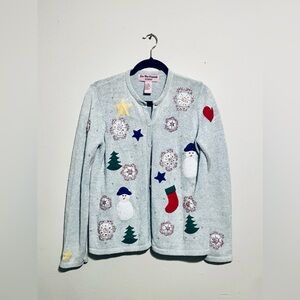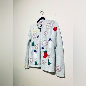 Cozy cardigan with snowman and holiday motifs. Features stars, trees, and snowflakes.