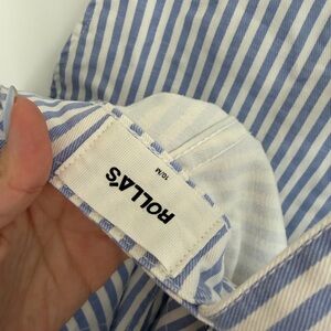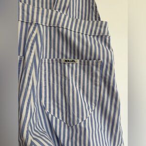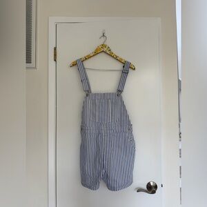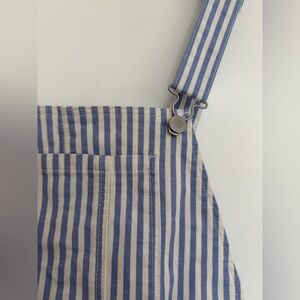 Chic denim overalls with blue and white stripes. Perfect for a casual look. Excellent condition