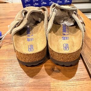 Soft suede upper in neutral taupe. Single adjustable metal buckle. Supportive cork footbed for all-day wear. Casual, versatile design. New with defect. Both clogs are taupe but the colors are slightly off from each other despite being a pair. Otherwise new in box. Box is in fair condition with signs of wear.