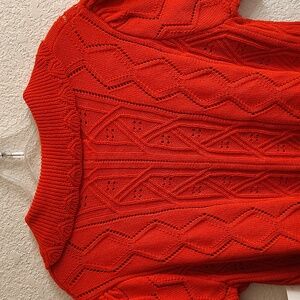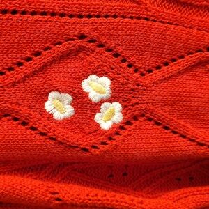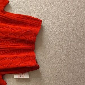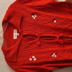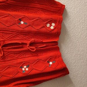 Party Festival Date Night Travel Vacation Office Bright red short-sleeve knit sweater. Tie-front closure with three bows. Diamond knit pattern with small embroidered flowers. Soft textured collar. Casual, vintage-inspired look. Armpit to Armpit 22 Length 17 (NEW WITH TAGS)