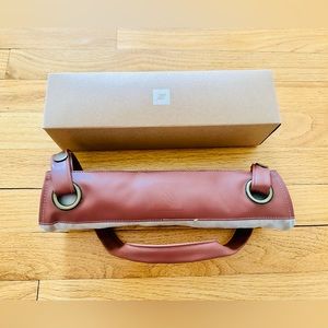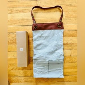 Upcycled Barista Apron is made of a canvas material with soft brown leather accents. Has front pockets.