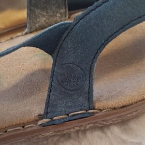 Beautiful and supportive Rieker Regina sandals in a versatile denim blue! These sandals feature the signature Rieker AntiStress technology, making them lightweight, flexible, and shock-absorbing. Perfect for all-day wear, travel, or casual outings. Product Details: Brand: Rieker Model: 628G9-16 (Regina) Style: Flat slingback sandals with decorative beaded medallions. Color: Navy/Denim Blue. Closure: Easy slip-on with functional elastic straps for a perfect fit. Size: EU 40 (Equivalent to US Women’s 8.5 or 9 — please check Rieker size chart). Condition: Good pre-owned condition. Light wear on the footbeds and outsoles as shown in photos. Plenty of life left! Features: Intricate beaded and rhinestone circular detailing on the T-strap. Cushioned soft footbed. Flexible, textured outsole for grip. Boho-chic, earthy aesthetic. #Rieker #BohoSandals #AntiStressShoes #ComfortFootwear #BeadedSandals #SummerStyle #WalkingShoes #TravelSandals #BlueSandals #EuroComfort
