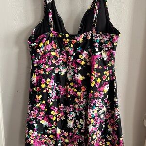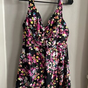 Lands' End one-piece swimdress with a floral print. Flattering V-neck and gathered waist. Skirted bottom with side slit. Supportive shoulder straps. Bright multicolor floral pattern on black base.