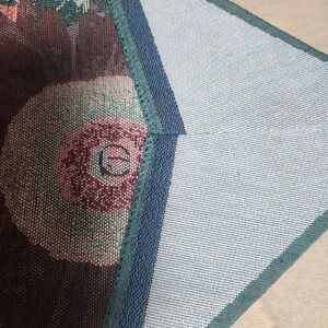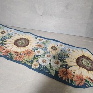 Brighten your home with this stunning tapestry table runner, a vibrant celebration of sunflowers and cheerful daisies. The rich blues and warm floral tones create a welcoming atmosphere, perfect for adding a touch of natural beauty to any dining setting. Its intricate woven design showcases large sunflowers. Small stain on underside, hard to see. Material: Tapestry, Cloth, Polyester Blend Type: Table Runner Pattern: Sunflower Occasion: Party, Fall, Multipurpose Theme: Fall, Garden, Farm Life Features: Machine Washable Shape: Wedge Department: Adults, Unisex Style: Farmhouse Item Length: 71-90 in Item Width: 16-20 in Unit Type: Unit Keywords: table runner, sunflower decor, floral runner, tapestry runner, kitchen decor, dining table, home accent, woven table linen, summer decor, fall decor, garden theme, blue floral, country chic