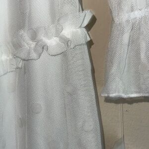 This enchanting dress by B Darlin showcases a ruffled, tiered design in a pristine white hue, perfect for a bride or wedding guest. The long bishop sleeves and v-neckline add a touch of elegance, while the babydoll style offers a playful silhouette. Crafted with attention to detail, this dress is a beautiful choice for special occasions.