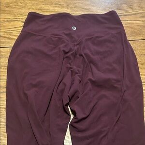Soft high-waist leggings in a deep maroon color. Stretchy, smooth fabric with cuffed ankles. Great for workouts or casual wear. size 6 gently worn