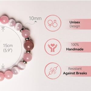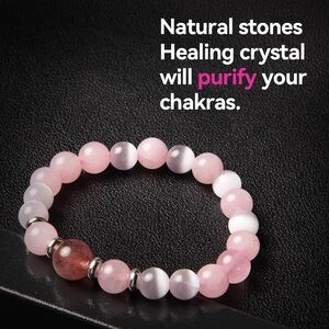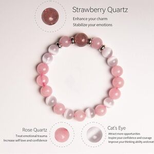 A strawberry quartz, rose quartz, and white cat eye bracelet combines stones focused onlove, emotional healing, and mental clarity. These bracelets often feature pink strawberry quartz for joy and inner love, soft rose quartz for compassion, and white cat eye to improve focus and intuition