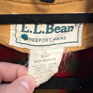 L.L. Bean field coat in tan canvas with classic red plaid lining.