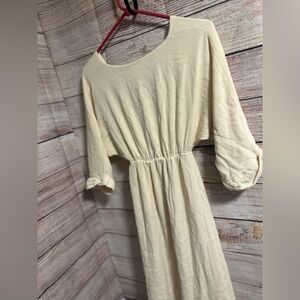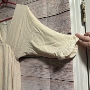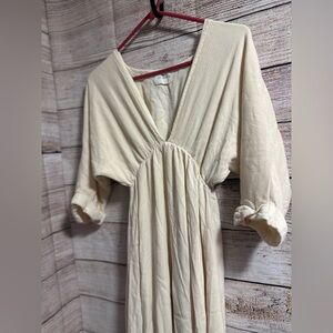 Elegant cream maxi dress with a deep V-neck and gathered waist. Soft, textured fabric offers comfortable drape and a relaxed fit. Three-quarter sleeves with roll-up detail for versatile styling. Ideal for casual outings or dressed-up occasions in a neutral cream tone.