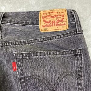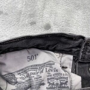 A classic pair of Levi's 501 jeans in a grey wash. These iconic jeans feature a button fly closure and a straight leg silhouette. The hem has been intentionally distressed for a modern, edgy look. The wash offers a versatile grey tone that can easily be dressed up or down. Perfect for casual everyday wear, concerts, or a night out with friends.