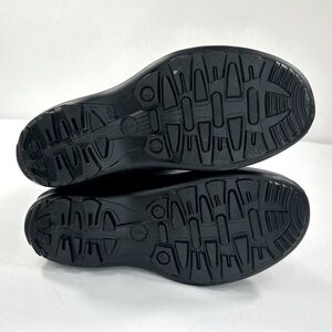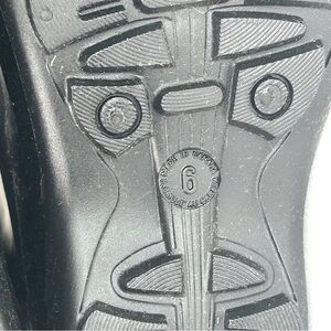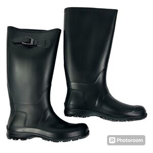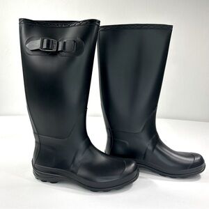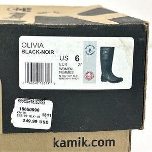 Kamik Olivia rain boots feature waterproof rubber uppers, buckle strap accent, 12½" shaft height, pull-on style, 14½" calf circumference, round toe, fabric lining, removable insole, 1" molded sole and treaded rubber sole, color black, size 6 Women's. Boots are new in the box.
