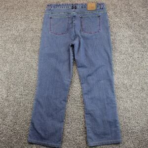 Vintage Lilly Pulitzer Jeans Womens 10 Blue Denim Stretch Preppy Y2K Straight. These iconic vintage jeans feature a classic straight-leg silhouette with a touch of spandex for the perfect comfort stretch. Designed with unique multi-color contrast stitching and a faded wash, these are perfect for a preppy, "Coastal Grandmother," or authentic Y2K aesthetic.