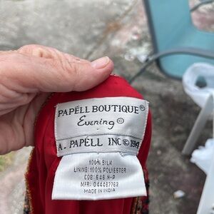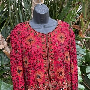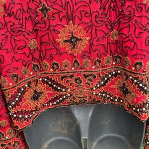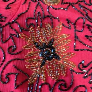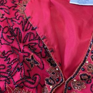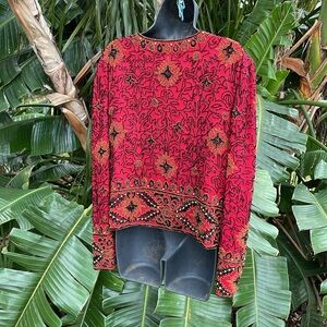 Who knew that Adriana Papel had a boutique section. Her standard beadwork has been upped a notch in this exquisitely beaded jacket. A combination of gold metallic, seeded, bead and black jack glass barrel beads and also a larger gold metallic bead combination on this beautiful exquisite piece. Hundred percent silk except for the beads of course fully lined in an excellent condition please know there are hook and eye closings. There are no size tags, please see my measurement photos. I’m going to list as a large.