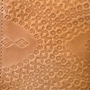 Elegant tan leather passport holder by Global Color. Features intricate embossed design.