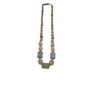 This vintage Czechoslovakian necklace features ribbed satin glass beads in soft pastel hues. Its textured beads and clasp add timeless charm.