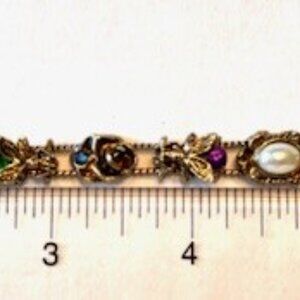 Vintage woman's bracelet. Great condition. Gold/brass-tone. "Floating" charms include a bee, pearl, flower, rose, etc. Fold over clasp. Approximately 8".