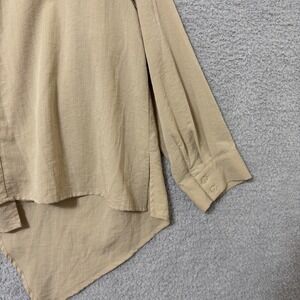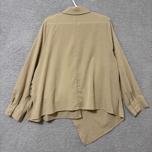 Eloquii lightweight beige wrap-style blouse with a structured collar, a flattering tie front detail and asymmetrical hemline. Made from a rayon, polyester, and nylon blend, giving it a breathable feel with a soft, slightly structured drape.