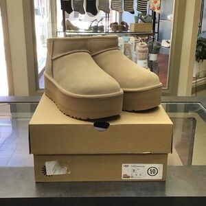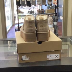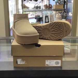 Low ankle platform boot with chunky sole. Soft suede upper and rounded toe. Plush interior lining for comfort. Neutral tan hue pairs with casual looks.