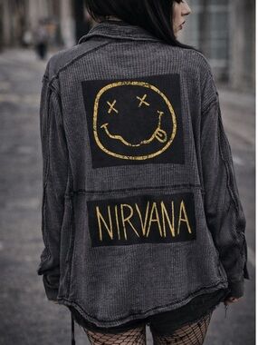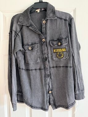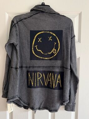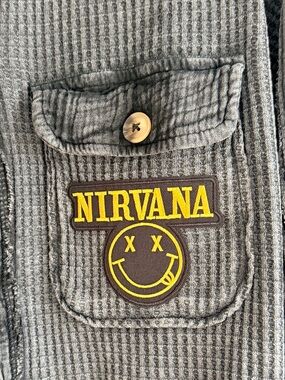 Custom Upcycled NIRVANA graphic tee. Added to a waffle knit mineral washed black button down. Patch added to one pocket. Marked an XS, but VERY OVERSIZED. Shirt still has tags on! Measurements are approximate: