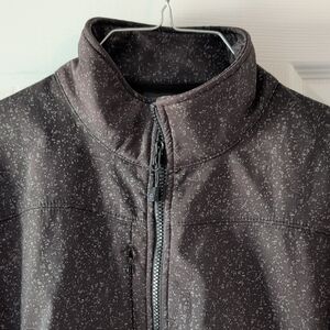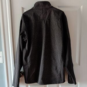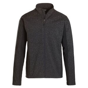 Stylish black speckled jacket with a full-length zipper. Lightweight, flexible panels for comfortable movement. Secure zip pockets and a high collar for added coverage. Sleek design suitable for everyday wear.