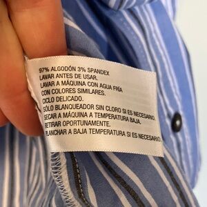 Lightweight button-front shirt with vertical blue and white stripes. Classic collar and single chest pocket. Roll-up sleeve friendly. Clean, versatile style for layering or workwear.