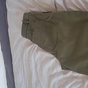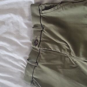 SPANX trousers featuring an olive green waistband. Clean stitching and branded label. Subtle, tailored look suitable for many outfits.