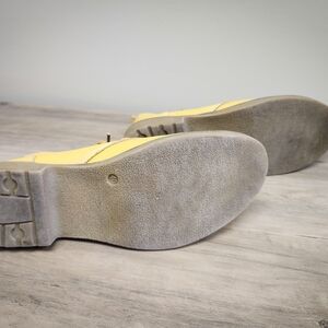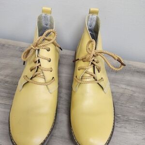 Bright yellow leather lace-up boots. Round toe with contrast stitching and rubber sole. Casual, easy-to-style design. Comfortable lace closure.