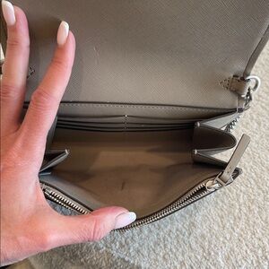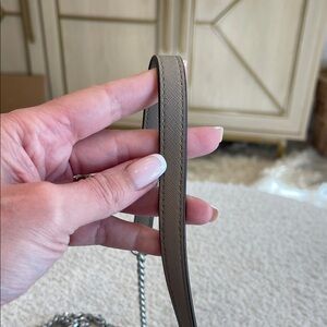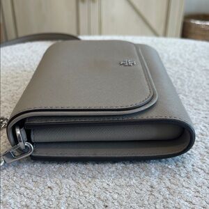 Compact taupe leather crossbody with flap closure. Features subtle gold-tone logo hardware. Slim, structured silhouette for easy carrying. Neutral hue pairs well with many outfits.