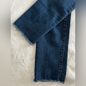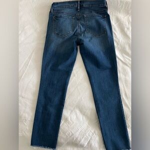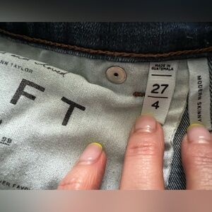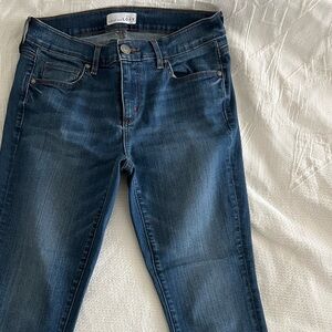 Classic LOFT skinny jeans in a dark blue wash. Slim fit through hips and legs. Five-pocket styling with subtle fading. Stretch denim for comfortable wear. Versatile wardrobe staple.