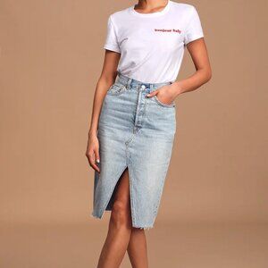 Deconstructed Light Wash Denim High-Rise Midi Skirt