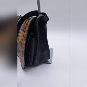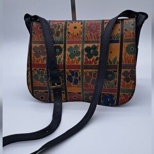 This retired, colorful, patterned leather bag is the Venezia Crossbody from Patricia Nash. It features a "Floral Square" or "Floral Block" print on 100% full-grain leather, with an Italian-inspired, vintage aesthetic.