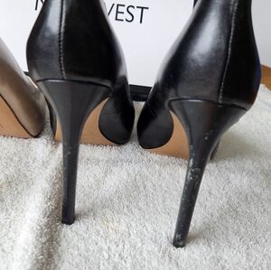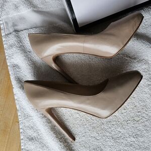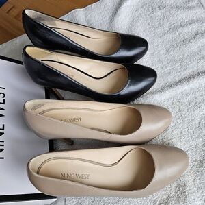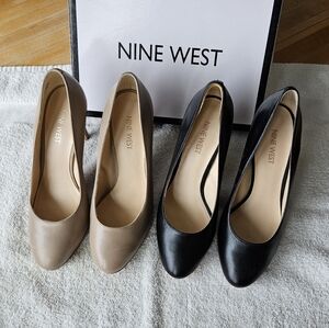 These sleek pointed-toe pumps from Nine West are made from smooth leather material with a polished finish. Classic silhouette for work or dressy looks. Neutral black and taupe pairings for versatile styling.
