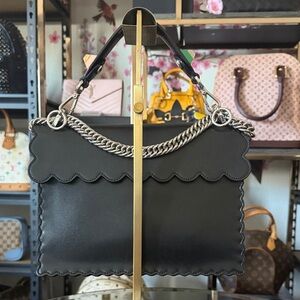 Black leather satchel with scalloped edge detail. Multicolored circular studs line the flap. Top handle and chain strap hardware. Decorative beaded charm with Fendi logo. Clean, fashion-forward silhouette.