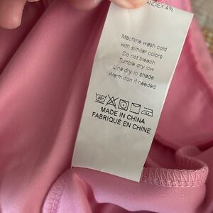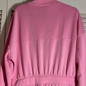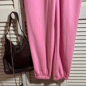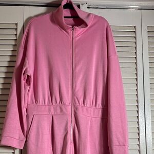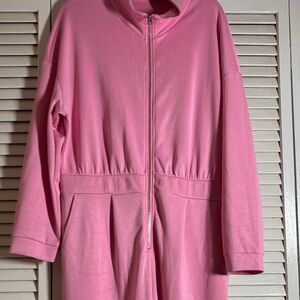 Bright pink zip-front jumpsuit. Long sleeves with elasticized ankle cuffs. Front pockets and a high collar. Smooth, mid weight fabric. Easy throw-on style. Gorgeous 24.5 inches pit to pit. 29 inch inseam. Tags pictured