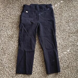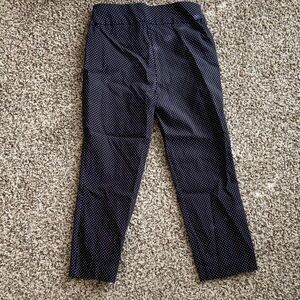 Comfortable navy polka dot stretch pants for everyday wear. Soft, flexible fabric allows easy movement. Elastic waistband provides a secure, comfortable fit. Navy color with small white dots adds classic, playful style.