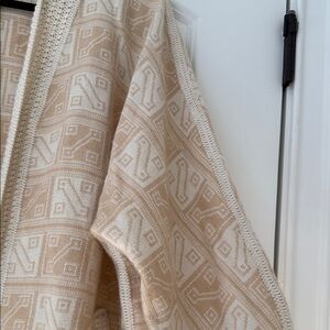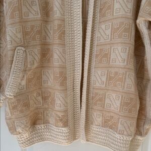 light cream open-front cardigan with a subtle geometric knit pattern. Soft, lightweight knit designed for layering and everyday comfort. Features textured trim and front pockets for functional detail. Neutral cream hue pairs easily with casual and dressier looks.