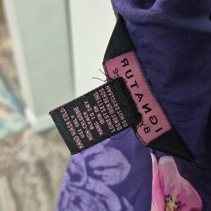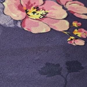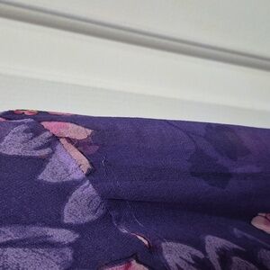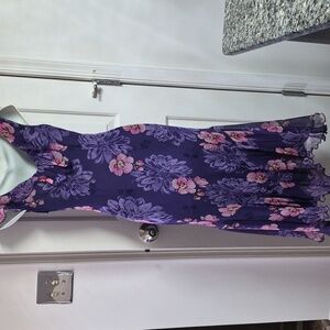 Elegant purple floral dress with pull over style & ruffle-trim neckline. Lightweight, flowy fabric with pink floral accents, & sequin & bead embellishments for a feminine look. Designed for comfortable all-day wear and easy styling. Features a flattering fit and subtle ruffled shark bite hem. Perfect for an outdoor summer wedding or party! Good used condition (see photos for exact condition). Pit to pit measurement is 17".